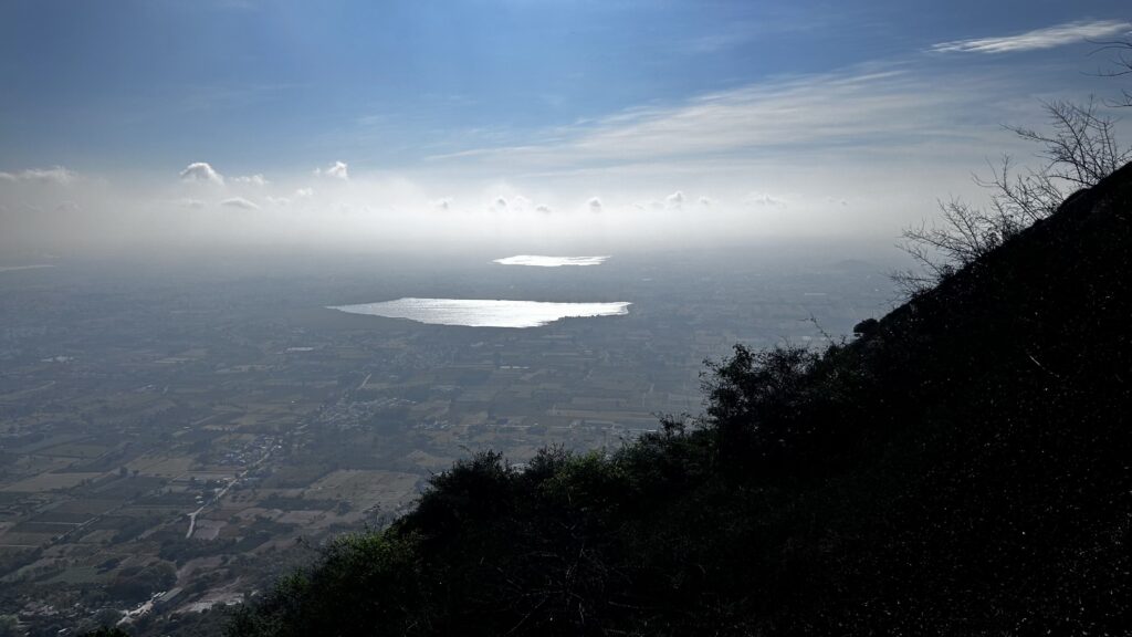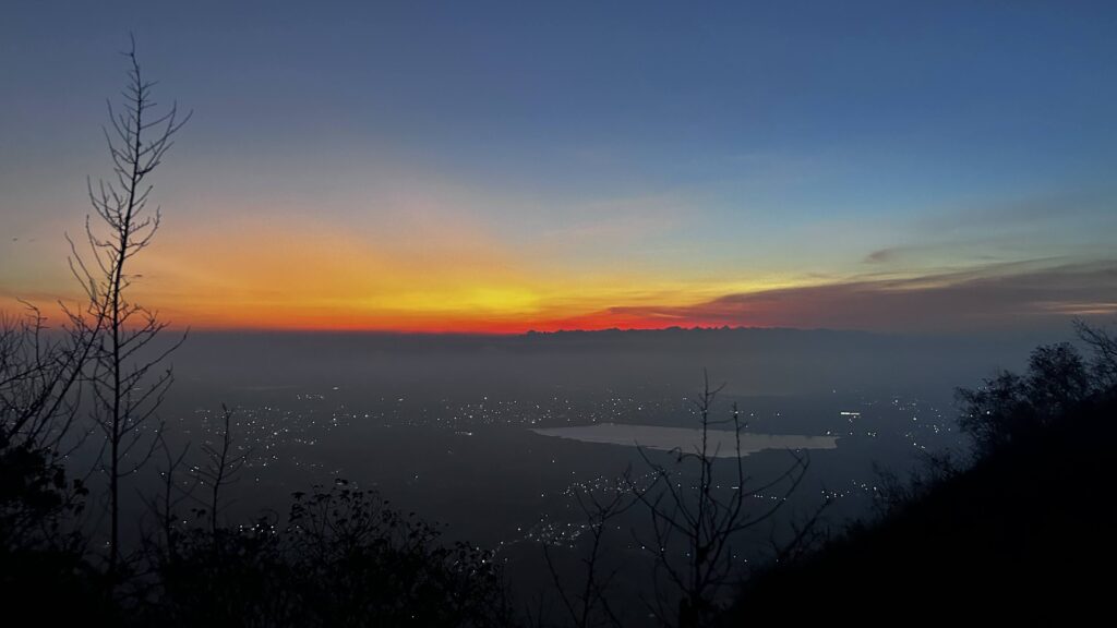 We were eagerly waiting for the sun to rise, but it seemed like the sun had other plans – constantly playing hide and seek with the clouds for while, before making itself visible. In the distance you will see a couple of lakes which adds to the scenic beauty.