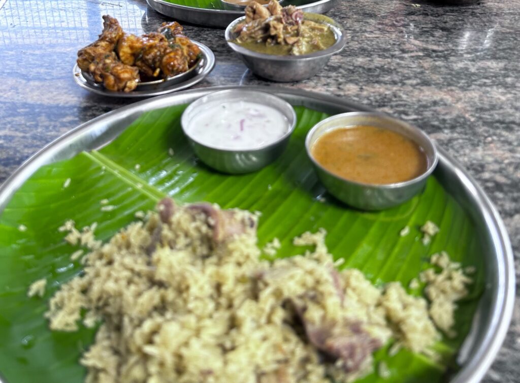 Since we were hungry, we began exploring options as to where we could stop to grab a bite. The obvious option that came to mind was Nandi Upachar. Since we had already visited this place a few times, we decided to go to this place called Suresh Gowda Military Hotel. This is a naati style non veg restaurant – vegetarians should stay away! Surprisingly, they were open at 10 AM in the morning with a limited menu serving mutton biryani, chicken fry and chicken masala. All other items they said would be available closer to 12 noon.